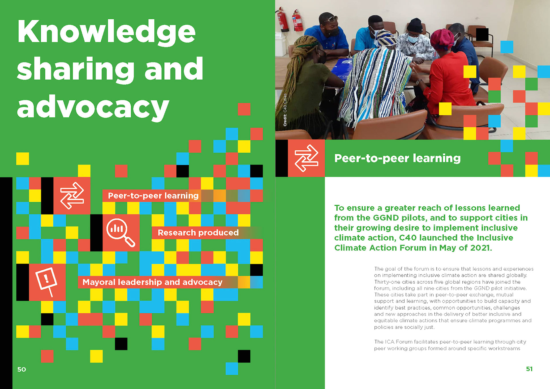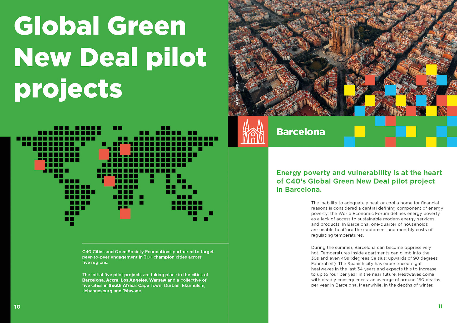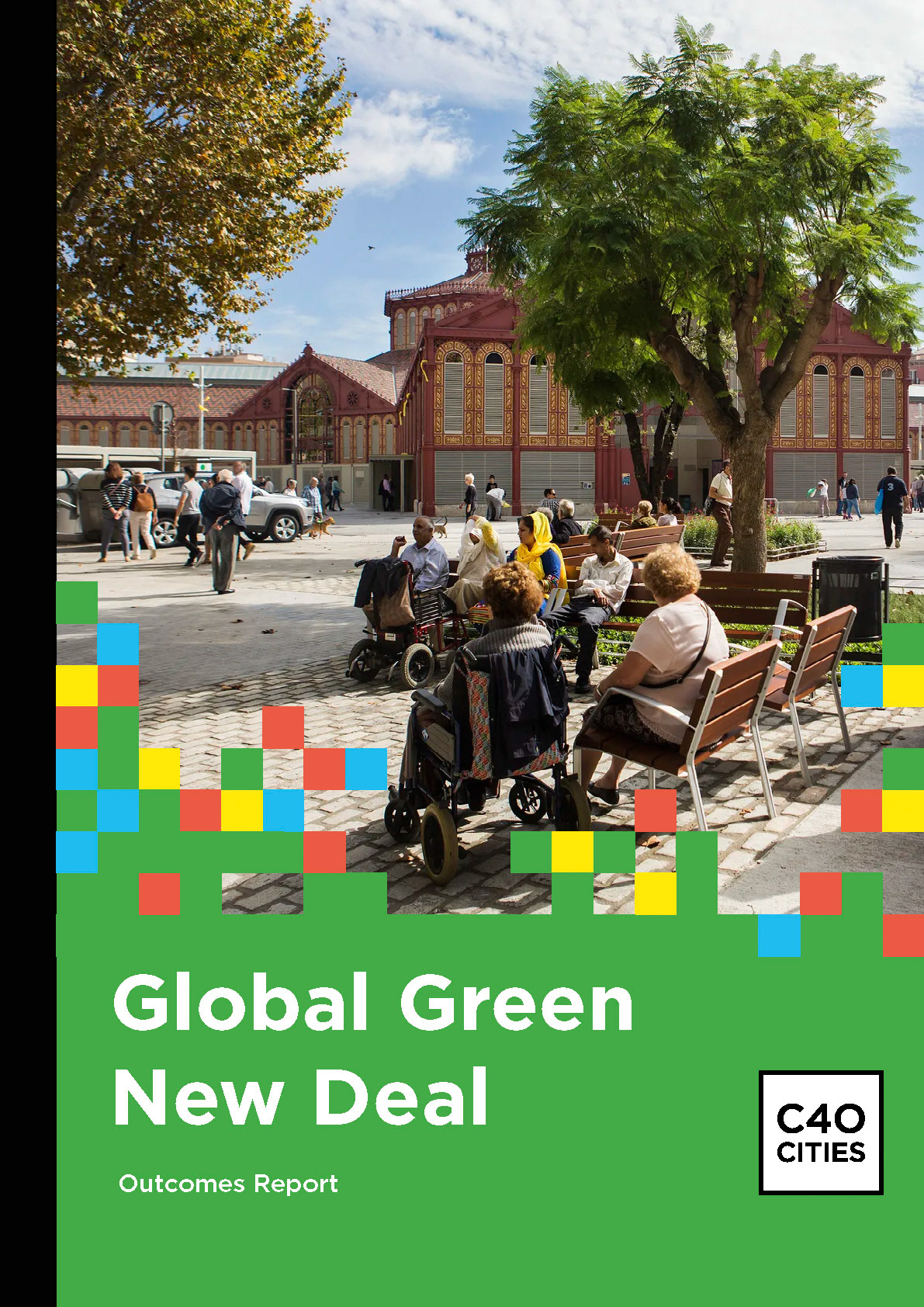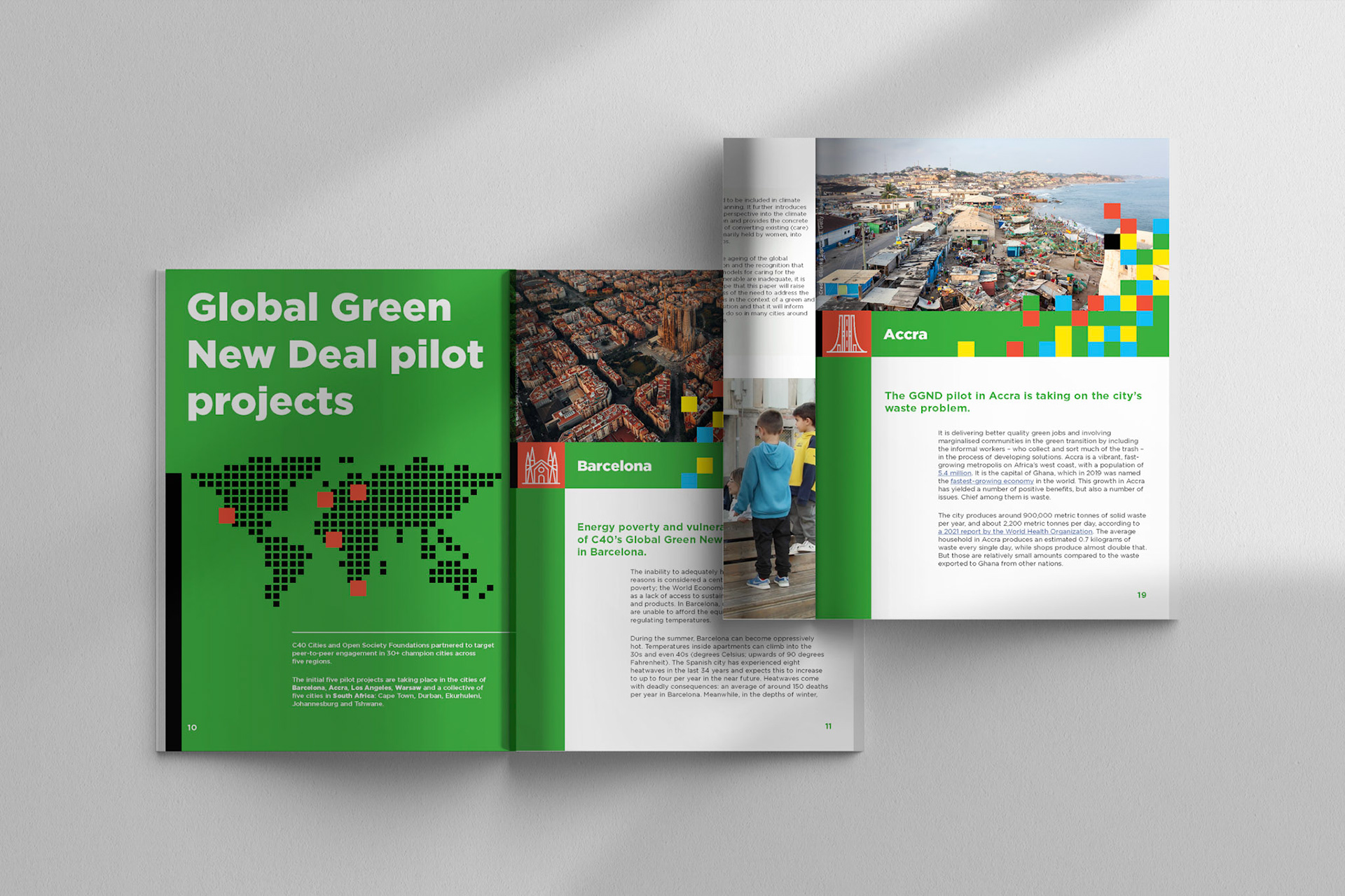 Engaging graphic design and typesetting for this 80-page C40 report outlining outcomes from global green new deal projects.
