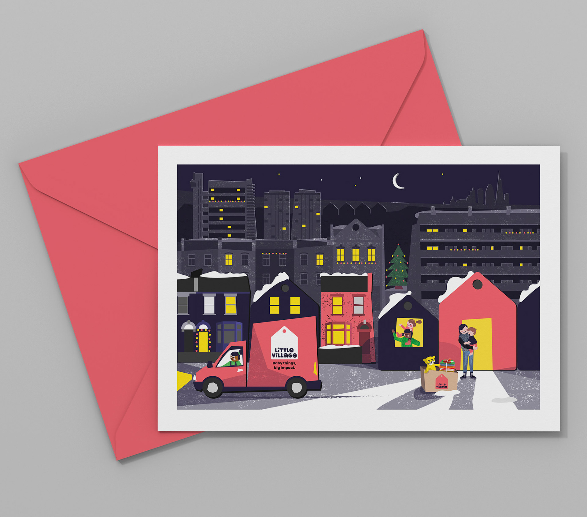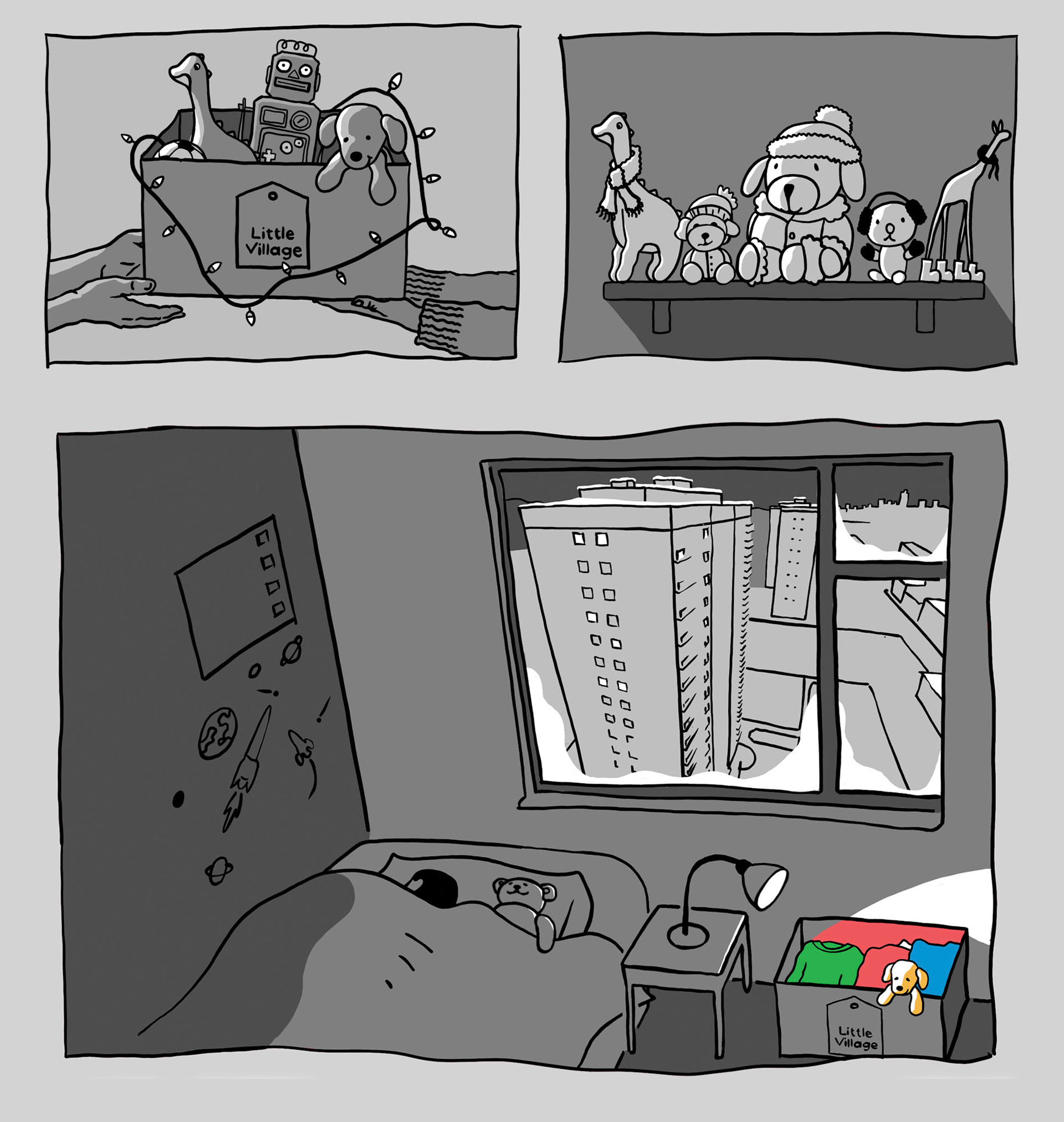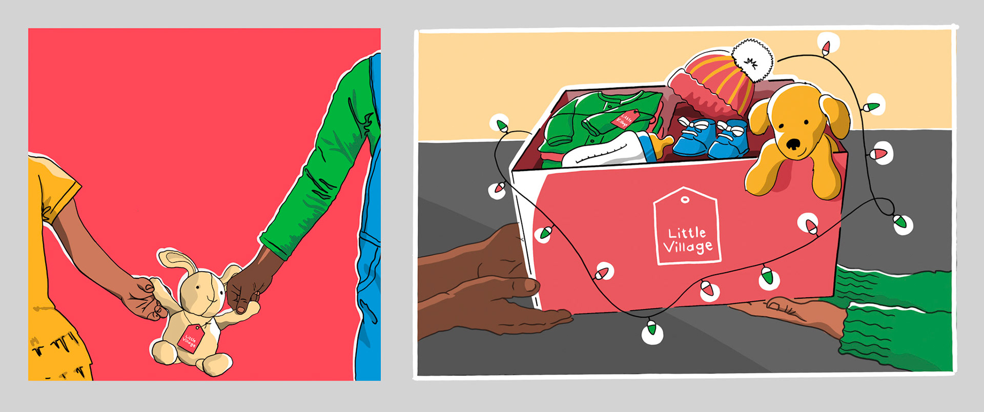 I created an illustration style for this London child poverty charity's Christmas campaign. I began with some grey scamps (including one of my favourite pieces of work – the child's bedroom), before working up a final version showing the gifting of a box of toys and baby essentials.