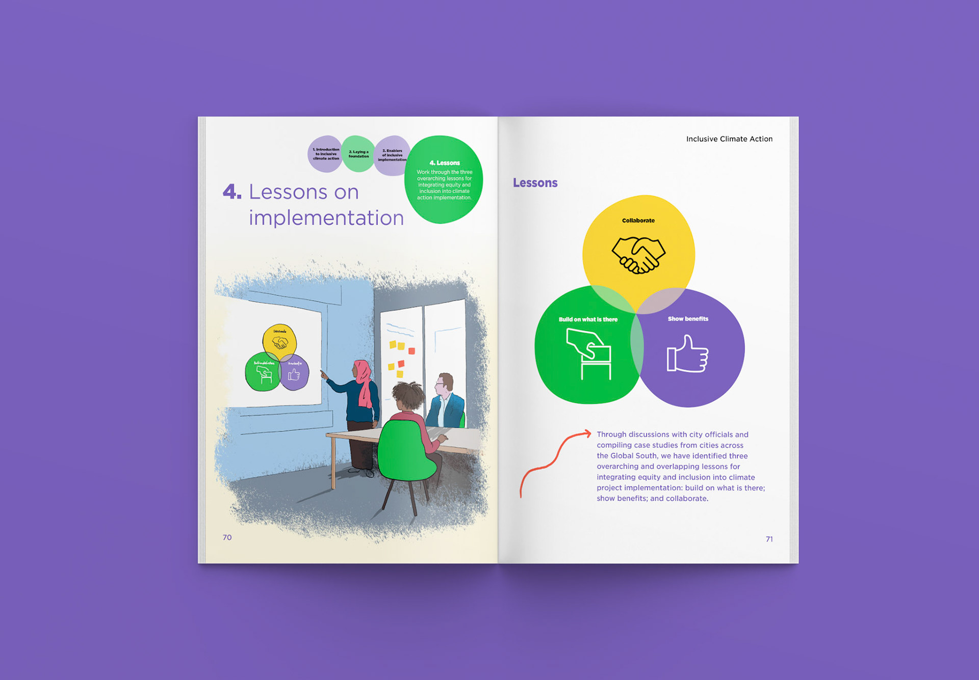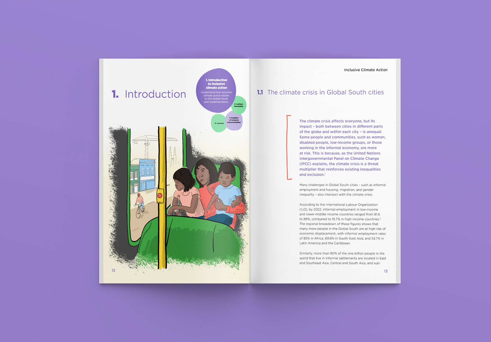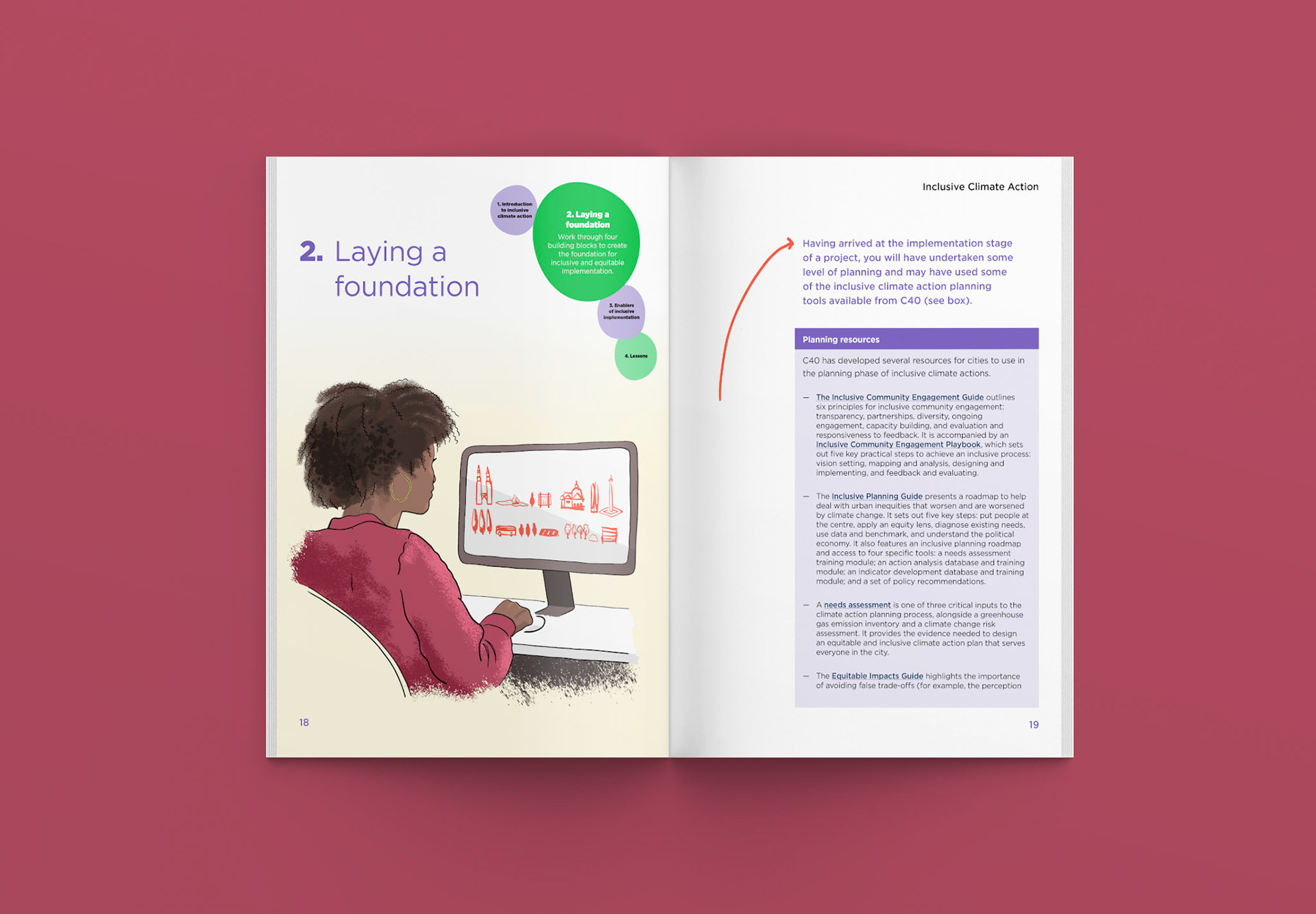 This 93-page Implementation Guide for C40’s Inclusive Climate Action team included the development of five full-page illustrations, alongside a series of background drawings.