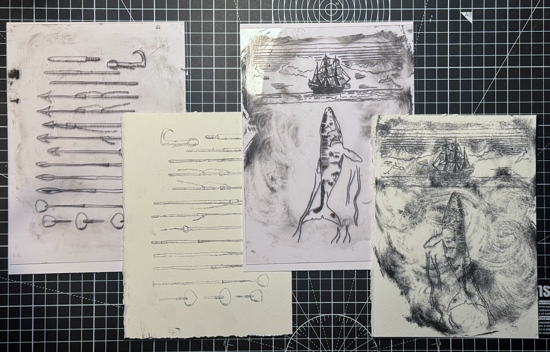Taking Herman Melville's Moby Dick as inspiration, I drew a set of harpoons and whaling tools, and an illustration of a huge whale below a ship. I copied these into dry point prints, and then mocked them up as a book frontispiece and cover.