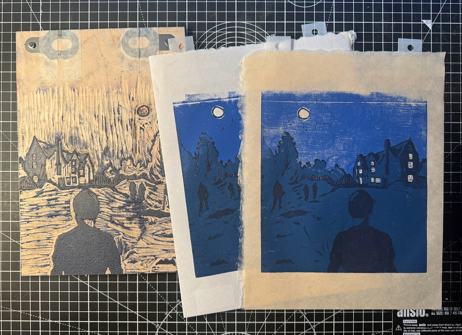 Taking Yeats's poem 'The Choice' as inspiration, I created an imaginary night-time dreamscape of people walking up a hill to an old house. The initial sketch was digital and I also cut out the house using glue, paper and ink, before printing a rough woodcut.